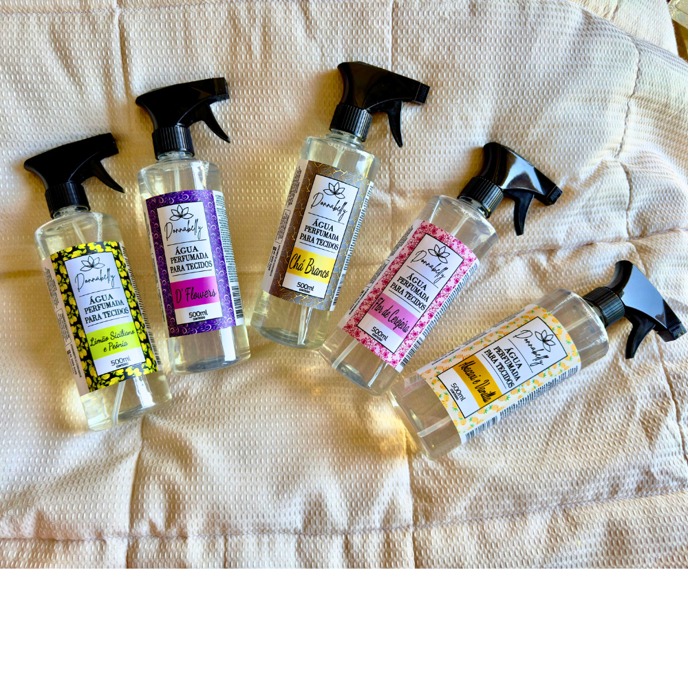 Que tal experimentar a Água Perfumada para Tecidos nos aromas de Chá Branco, Flor de Cerejeira, D'Flowers e Limão Siciliano e Peônia?