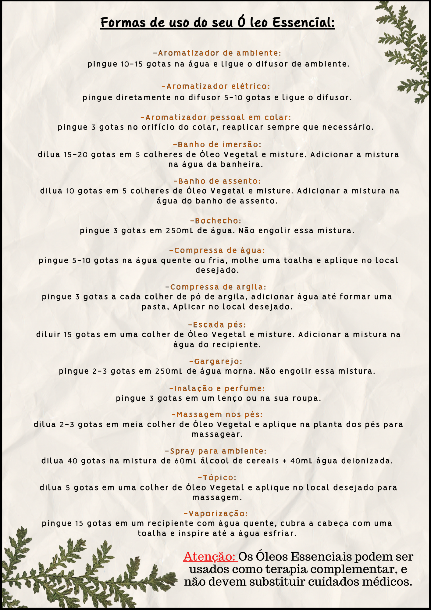 -Escalda pés: diluir 15 gotas em uma colher de Óleo Vegetal e misture. Adicionar a mistura na água do recipiente.