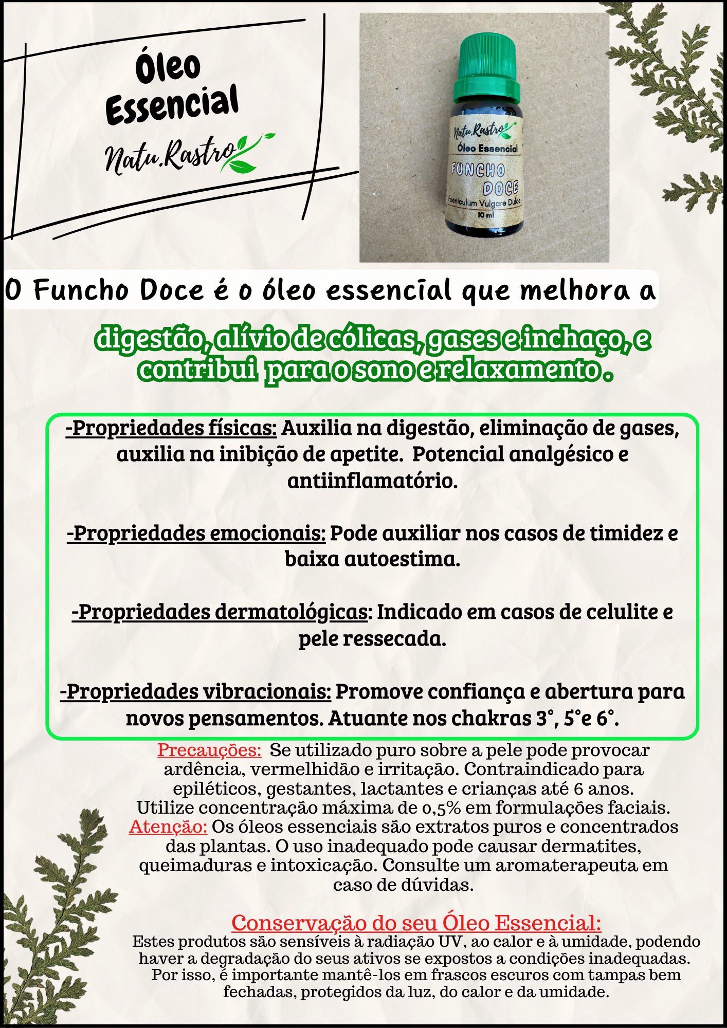 Óleo Essencial de Funcho Doce Natu.Rastro 10ml